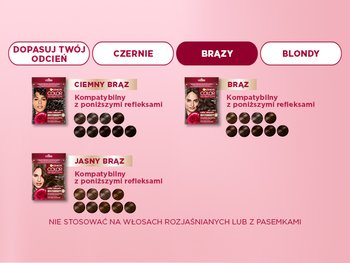 Wybierz jeden z brązowych odcieni szamponetki: Brąz, Jasny Brąz lub Ciemny Brąz.